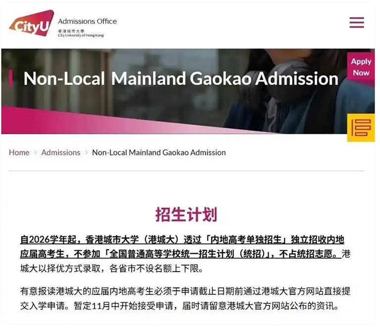 香港城市大学(简称 “港城大”)正式官宣:自 2026 学年起,终止通过 “全国普通高等学校统一招生计划”(统招)录取内地应届高考生,全面切换为 “内地高考单独招生” 模式!这一调整标志着香港 8 所公立大学中,仅香港中文大学仍保留高考统招渠道(截至目前官网未发布调整通知)。